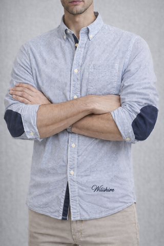 Camisa azul con coderas blancas
