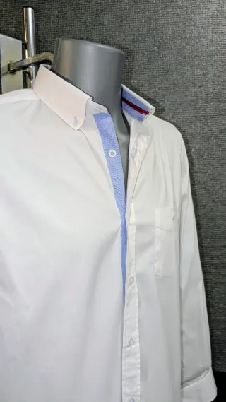 Camisa blanca con coderas azul marino para hombre. Nueva a estrenar y de altísima calidad. El tejido es de los mas cómodos posibles ideal para cualquier temperatura. Elegante y moderna, es de una marca local que se está haciendo famosa.