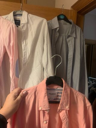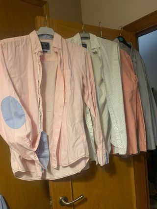 Lote de cuatro camisas de tonos claros, perfectas para un estilo casual o formal.Distintas tallas pero equivalen todas a talla S - Camisa rosa con coderas. - Camisa blanca con estampado de puntos. - Camisa rosa. - Camisa de rayas.