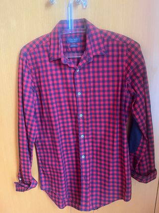 Conjunto de prendas de vestir para hombre diferentes marcas: - Camisa cuadros pequeños rojo y azul de la firma Pepe Jeans ( Slim fit) - Camisa a cuadros rojo y blanco de la firma Studio (regular fit) - Camisa cuadro azul, rojo y blanco, y verde, coderas azules de la firma Studio ( regular fit) - Camisa de Zara verde claro con cuello mao (regular fit) - Jersey de punto con cuello alto y cierre en cremallera de la firma Titto Bluni en azul marino y coderas en gris oscuro. El ancho de sisa a sisa de todas las camisas está entre 52 a 55 cm. El jersey 56cm se sisa a sisa. Lote completo 15€ por separado 5€ cada prenda