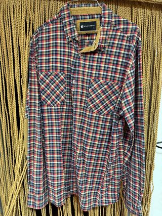 Camisa de manga larga con un diseño a cuadros rojos y azul. Presenta parches decorativos en la parte delantera y coderas en las mangas.