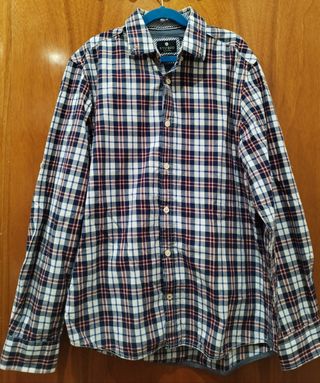 Camisa de cuadros de colores blanco, azul, naranja y rojo (detalles de la prenda en las fotos). Está en muy buen estado (marca Studio Classics), poco usada, talla S (2) y estilo SLIM fit. Prenda elegante y casual, con coderas y colorida.