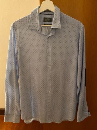 CAMISA MANGA LARGA A CUADROS CON CODERAS COLOR AZUL CLARO A JUEGO CON CUELLO Y PUÑOS TALLA L MASSIMO DUTTI SLIM FIT EN PERFECTO ESTADO MODA CHICO HOMBRE