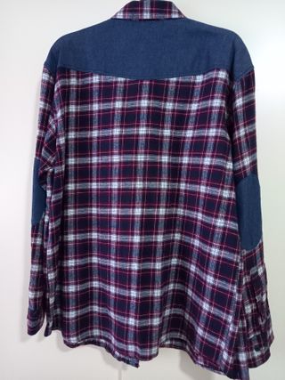 Camisa cuadros paño, talla XL con adornos tejanos en bosillo, hombros y coderas, manga larga
