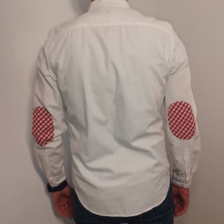 Camisa de Massimo Dutti, es blanca con coderas marrones. Talla XXL, medida de sisa a sisa:65cm, hombros 50cm, largo 74. Tiene algunos desperfectos por uso.