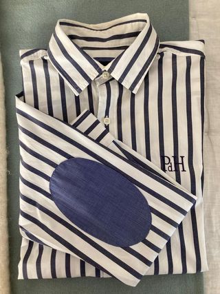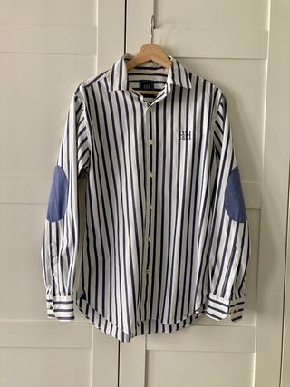 Camisa a rayas blancas y azul marino, con coderas azul marino. Tiene una ligera marca de roce, en el pliegue del cuello de la camisa, se ve en las fotos. Es apenas perceptible.