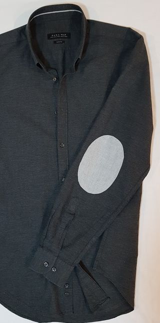 Camisa de hombre gris oscuro con coderas en gris claro. Slim fit. Sin bolsillos. Puños ajustables a dos medidas. 100% algodón.