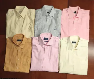 Conjunto de seis camisas de vestir para hombre en diferentes tonos, de algodón. También son de diferentes marcas. Se han usado poco. - Camisa beige de manga larga. - Camisa a rayas grises y blancas. - Camisa rosa de manga larga. - Camisa color mostaza de manga larga. - Camisa lila de manga larga. - Camisa beige de manga corta.