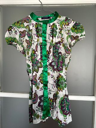 Camisa de verano con un bonito estampado floral y detalles de cinta verde. - Diseño con cuello mao y manga corta abullonada. - Cierre de botones delanteros. - Tejido ligero y transpirable.