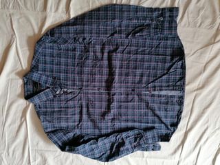 Camisa manga larga color azul con rayas rojas a modo de cuadros Largo (desde hombro): 72 cm; Ancho (entre axilas): 56 cm; Manga (desde axila): 50 cm