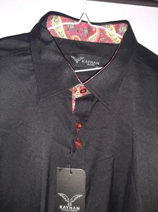Camisa de manga larga para hombre con un diseño elegante y moderno. Presenta un llamativo estampado en el cuello y los puños. - Cuello y puños con estampado paisley. - Botones frontales a tono. - Nueva con Vestido camisero con un bonito estampado. - Diseño camisero. - Cinturón a juego. - Manga larga. - Preciosos botones. - Talla 44. Usado una vez. Todas las medidas están en las fotos.. 🏷 - Talla XXL.