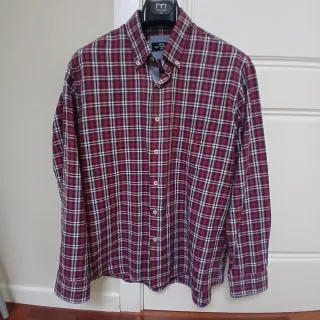 Camisa de vestir Dario Beltran para hombre. Manga larga, talla 44. con estampado de cuadros en tonos rojo y negros. Excelente acabado en cuello y puños. Muy buen estado, prácticamente como nueva.
