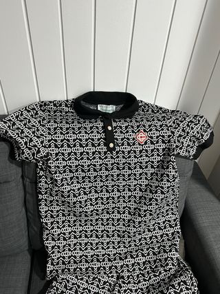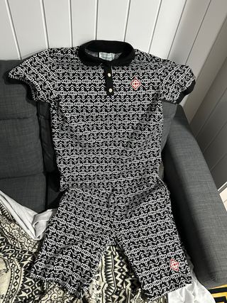 Conjunto de dos piezas con un llamativo estampado. - Camisa tipo polo con cuello. - Pantalón corto. - Diseño geométrico. - Logo en la prenda.
