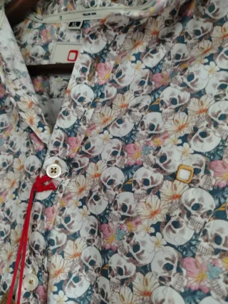 Camisa de manga larga con un diseño original y llamativo. Mide de sisa a sisa 58 cm. De hombro a hombro 50 cm. - Estampado de dibujos y frases. - Cuello camisero. - Cierre de botones.