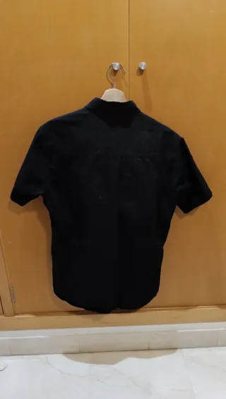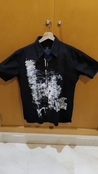 Camisa negra de manga corta con un llamativo estampado blanco en la parte frontal. - Diseño con estampado abstracto. - Cuello camisero. - Cierre de botones. - Falta un botón (ver fotos).