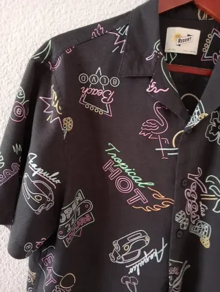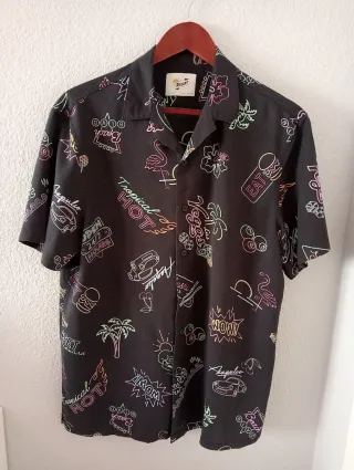 Camisa de manga corta con un llamativo estampado de neón sobre fondo negro. Presenta motivos veraniegos y frases. En muy buen estado. La tela fresquita. - Estampado de neón con temática tropical. - Cuello camisero. - Cierre de botones.