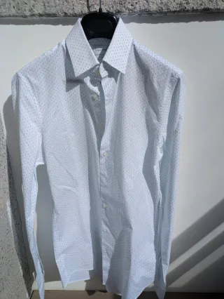 Camisa de manga larga con un diseño moderno y fresco. - Corte slim fit. - Estampado floral en tonos azules y blancos. - Cuello sin botones Usada solo un par de ocasiones.