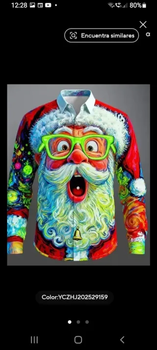 Camisa con estampado navideño de Santa Claus. El diseño es vibrante y llamativo. - Estampado de Santa Claus con gafas verdes. - Detalles coloridos en las mangas y el cuerpo de la camisa. - Cuello de camisa clásico.