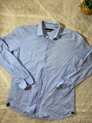 Camisa de vestir para hombre marca Pull & Bear, talla 40, modelo Slim Fit. Es de color azul claro con un discreto estampado, manga larga, cuello camisero, cierre con botones y bolsillo en el pecho. Con dos botones de repuesto. Medidas: - Largo 74 cm - Sisa 56 cm - Hombros 47 cm - Manga 66 cm