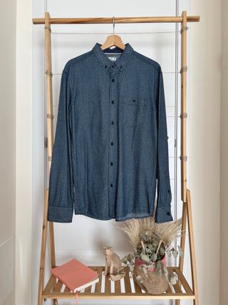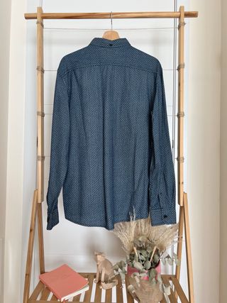 Camisa de manga larga con un estampado discreto. - Color azul con detalles dorados. - Cuello camisero. - Cierre de botones. - 100% Algodón. Más prendas de esta talla en mi perfil, hago lotes. Entrega en Madrid algún fin de semana.