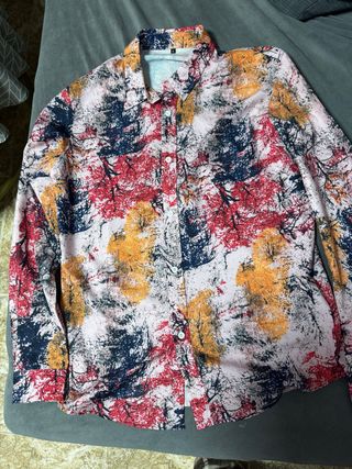 Camisa de manga larga con un diseño abstracto y colorido que evoca un paisaje de árboles. - Estampado multicolor con tonos rojos, amarillos, azules y rosas. - Cuello camisero. - Cierre de botones.