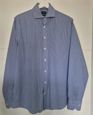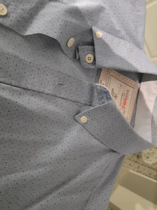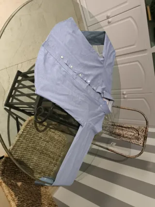 Camisa Pull & Bear de manga larga. Cuello con botones. Doble boton en puño mas boton de ajuste de manga. Boton en parte trasera de cuello. Trabilla en parte trasera para colgar prenda. Talla L. Moda hombre. Color blanco con pequeños estampados en azul, parte interior de puños en azul. Perfecto estado. 15 euros