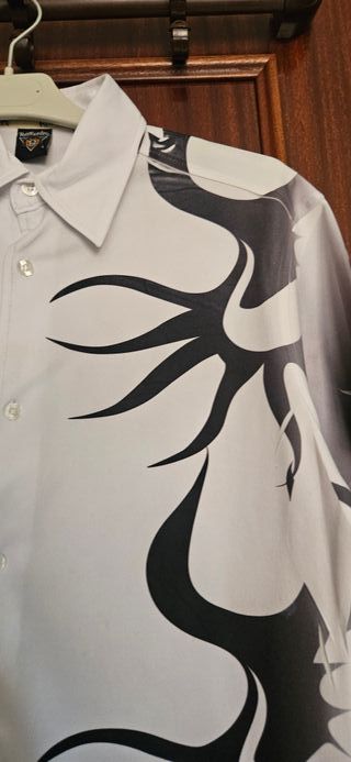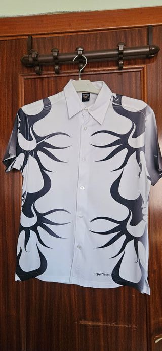 Camisa de manga corta con un llamativo estampado de llamas en contraste. Da poca talla. Vale para S. - Diseño de llamas en negro sobre fondo blanco. - Cuello camisero y cierre de botones. - Logo de la marca en la parte inferior.
