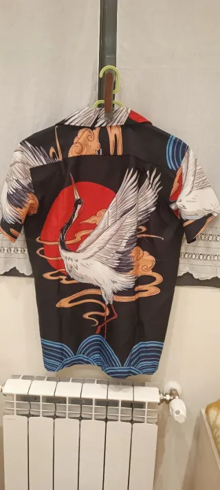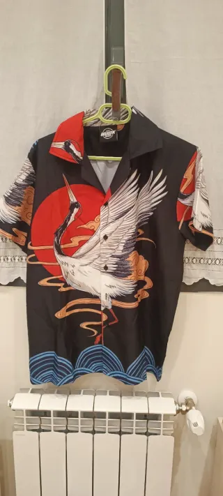 Camisa de manga corta con un llamativo estampado de grullas y elementos orientales sobre fondo negro. Cuello camisero clásico. - Diseño con grulla, sol rojo y olas. - Tejido ligero y transpirable.