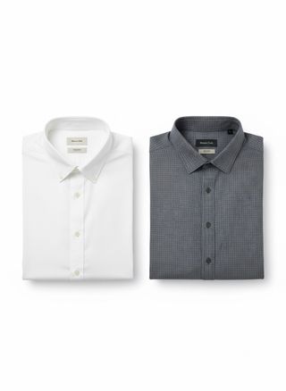 Dos camisas de la marca Massimo Dutti en talla XXL. Un clásico imprescindible para cualquier armario. - Camisa blanca de vestir. - Camisa gris con microestampado.