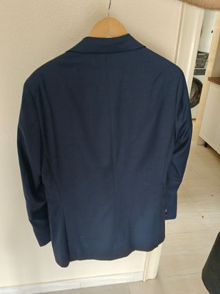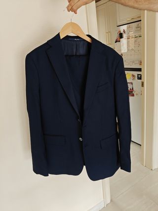 Elegante traje de dos piezas en tono azul marino. Perfecto para ocasiones formales o de negocios. Usado solo una vez, todo en perfecto estado. - Chaqueta con solapa de muesca. - Cierre de dos botones en la chaqueta. - Bolsillos frontales con solapa en la chaqueta. - Pantalón a juego. - Camisa blanca de vestir Massimo Dutti incluida. Se regala funda Boston para guardarlo. Tallas (EUR): Traje (americana): 50 Pantalón: 42 Camisa: 40