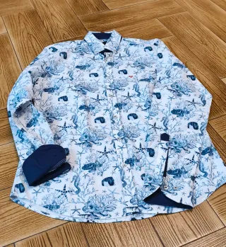 Camisa de manga larga para hombre con un diseño original inspirado en el mundo marino. Talla L - Estampado detallado de corales, estrellas de mar y caballitos de mar. - Cuello clásico con botones. - Puños abotonados.