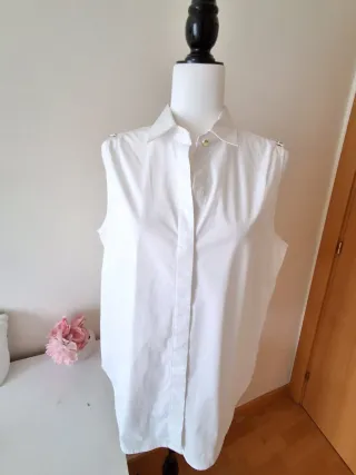 Elegante camisa sin mangas de Michael Kors. Algodón. Medidas largo 67cm y 57cm de sisa a sisa, como nueva, oportunidad. (16) - Color blanco. - Cuello camisero. - Detalle de botones dorados en los hombros.