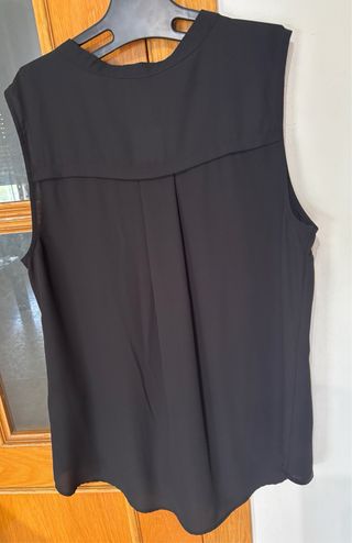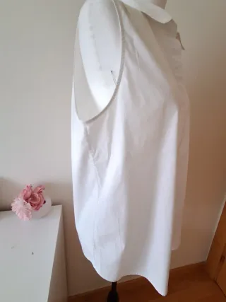 Camisa elegante sin mangas de la marca Cortefiel. En buen estado - Diseño con detalles circulares en el cuello. - Cierre de botones. - Confeccionada en tejido ligero. Mide de sisa 55cm. De hombros 33cm. De ancho 54cm. De largo 68cm.