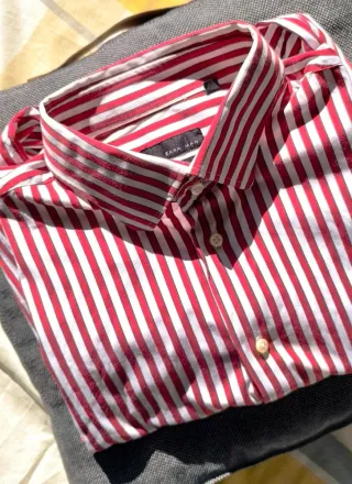 Camisa de Zara de rayas verticales en rojo y blanco. Para un entorno de oficina como para un estilo casual. Estado: Muy buen estado, muy cuidada. Sin manchas ni roces en cuello o puños. Material: 100% Algodón. Tela transpirable, de tacto suave y facil de plachar. Corte: Regular Fit, muy cómodo para el día a día. 📐 Medidas: Sisa a sisa (Pecho): 55 cm Largo total (desde el hombro): 67 cm Largo de manga (desde el hombro): 65 cm