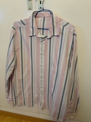 Camisa de manga larga con un diseño de rayas verticales en tonos rosa, blanco y azul marino. El cuello es clásico y tiene botones en la parte frontal. - Diseño de rayas verticales. - Cuello clásico. - Cierre de botones.