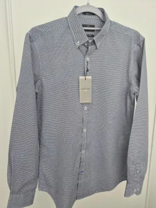 Camisa de manga larga con un discreto estampado geométrico en tonos grises. Ideal para un look casual o formal. Cuello camisero con botones ocultos. Cierre de botones. Puños abotonados. 60% algodón 40% poliéster. No tiene etiquetas pero está sin estrenar.
