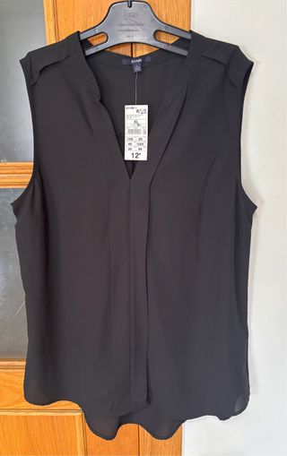 Camisa elegante sin mangas de la marca Kiabi. - Diseño con cuello en V. - Detalle de pliegues en la parte frontal. - Hombros con solapas decorativas. -Talla XL de tallas grandes.