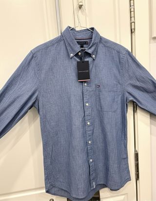 Vendo camisa Tommy Hilfiger completamente nueva con etiqueta, sin estrenar. Talla M hombre. Azul chambray de manga larga, cuello button-down, bolsillo delantero con logo bordado y ribete interior con los colores icónicos de la marca. Perfecta para un look casual o smart casual. Entrego en Barrio Salamanca.