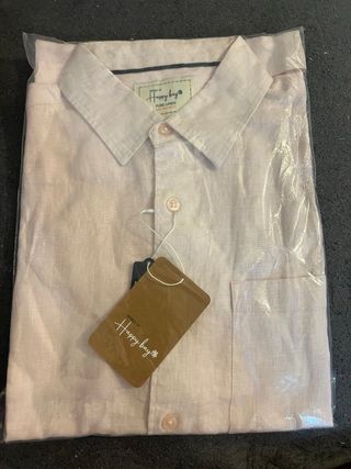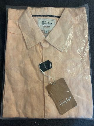 Camisa de manga corta de la marca Happy bay. - Material: 100% lino. - Color: Rosa pálido, Naranja pastel, negro y de rayas roja con blanca - Cuello camisero y sin cuello - Bolsillo en el pecho - Disponible en varias tayas S M XL
