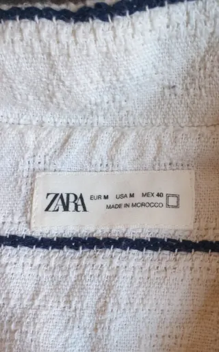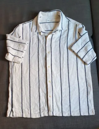Camisa de manga corta marca Zara Men hombre talla M. Nueva sin uso. Color blanco con líneas azul marino. - Tejido texturizado. - Cuello camisero. - Cierre de botones. * Más en mi perfil.