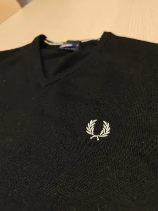 Jersey Fred Perry de lana merino 100% en color negro, cuello en pico y logo bordado en el pecho. Tejido fino, suave y muy cómodo, ideal para llevar solo o con camisa debajo. Talla M de hombre. Estilo clásico y atemporal, fácil de combinar con vaqueros, chinos o pantalón de vestir. Perfecto para otoño, invierno y entretiempo gracias a la lana merino, que abriga sin aportar peso. Medidas (ver fotos): 📏 Axila a Axila: 48 cm 📏 Largo: 67 cm 📏 Hombro a puño: 66 cm Más artículos Fred Perry en mi perfil. Todo original. ⭐ Perfecto estado ⭐