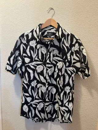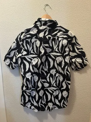Camisa de manga corta con estampado floral en blanco y negro. - Diseño con cuello. - Cierre de botones. - Estampado de flores y hojas. Talla S Marca H&M Sin uso