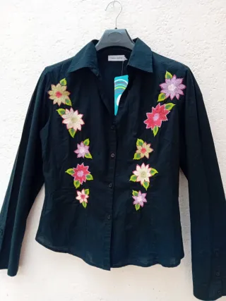 Camisa de manga larga con un diseño floral bordado en vivos colores. Cuello camisero. Cierre de botones. Tejido calidad y confort 100% algodón. Talla 42 y para menos Largo 60 cm Hombros 43 cm Axilas 51 cm Sin estrenar🆕️🏷 💥💥Precio con gran descuento, OCASIÓN MUY REBAJADA.