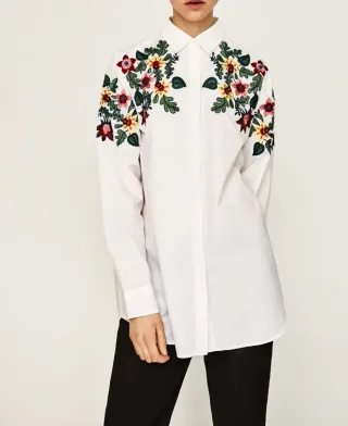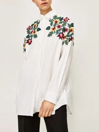 Camisa blanca de manga larga con un bonito bordado floral en los hombros. Diseño con cuello camisero, cierre de botones y bordado floral multicolor. Corte más largo por detrás que por delante. 100% algodón. A estrenar, nueva sin etiquetas.