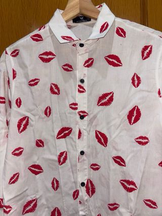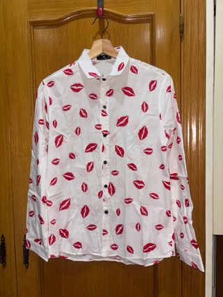 Camisa de manga larga para hombre con un divertido estampado de labios en rojo sobre fondo blanco. Talla S/ M. También sirve para mujer, si gusta - Cuello camisero. - Cierre de botones. - Diseño llamativo. -  nueva a estrenar sin etiqueta nunca usada