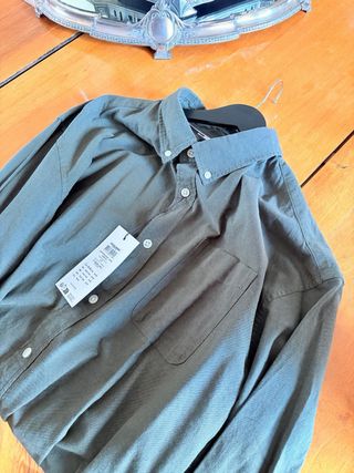 Camisa de manga larga de Zara en color caqui. Conserva la etiqueta original, indicando que es nueva. - Cierre de botones. - Cuello camisero. - Puños con botón.