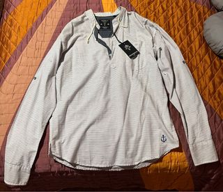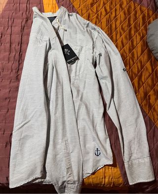 Camisa de manga larga con un diseño de rayas finas. Presenta un cuello con cordones y un pequeño bolsillo en el pecho. Un detalle de ancla bordada adorna la parte inferior. - Diseño de rayas verticales. - Cuello con cordón ajustable. - Bolsillo en el pecho. - Bordado de ancla. Esta nueva, sin usar.