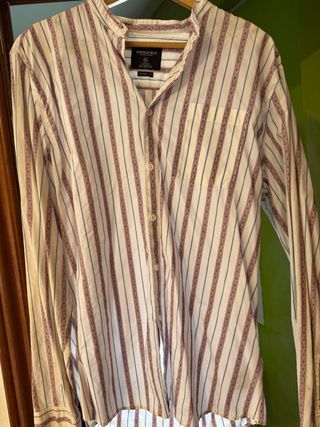 Camisa de manga larga con un diseño de rayas verticales. Nueva. Sin usar. Vendo porque me queda grande. - Cuello clásico. - Cierre de botones. - Dos bolsillos en el pecho. - Logo de la marca en uno de los bolsillos.