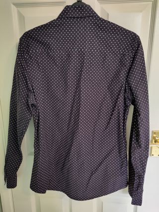 Camisa de manga larga con un diseño de lunares blancos sobre fondo morado. Presenta cuello de camisa y cierre de botones. - Marca: River Island - Diseño: Lunares blancos - Color: Morado Medidas: - Axila a axila: 47 cm - Axila a faldón inferior: 40.6 cm - Axila a puño: 44.45 cm En muy buen estado de conservación y uso, sin defectos ni taras.