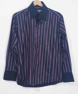 Camisa de vestir con un diseño de rayas verticales en morado y negro. El cuello es de corte clásico y los puños son anchos. - Diseño de rayas verticales. - Cuello clásico. - Puños anchos.